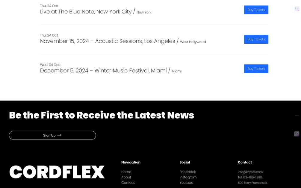 - Tour Page: Keep your fans informed about where and when you’ll be performing next. Easily update dates, venues, and ticket links.